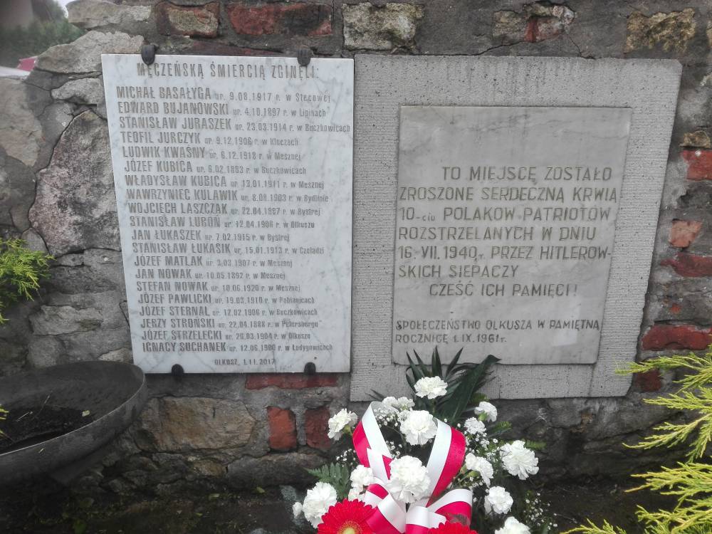 Już w styczniu 1945 r., kilka dni po ucieczce Niemców z Olkusza, w miejscach rozstrzelania dwudziestu Polaków stanęły drewniane krzyże z koroną z drutu kolczastego i metalowymi tablicami z wypisanymi ręcznie nazwiskami pomordowanych. Wtedy też ulicę Ogrodzieniecką przemianowano na 20 Straconych. 1 września 1961 roku, w dwóch miejscach straceń na symbolicznych obeliskach zostały odsłonięte tablice z napisem “To miejsce zostało zroszone serdeczną krwią 10-ciu Polaków, patriotów rozstrzelanych w dniu 16.VII.1940 roku przez hitlerowskich siepaczy. Cześć Ich Pamięci.” W 2017 roku, na prośbę potomków ofiar, staraniem olkuskiego magistratu na obeliskach zostały umieszczone pamiątkowe tablice z imiennymi listami ofiar.