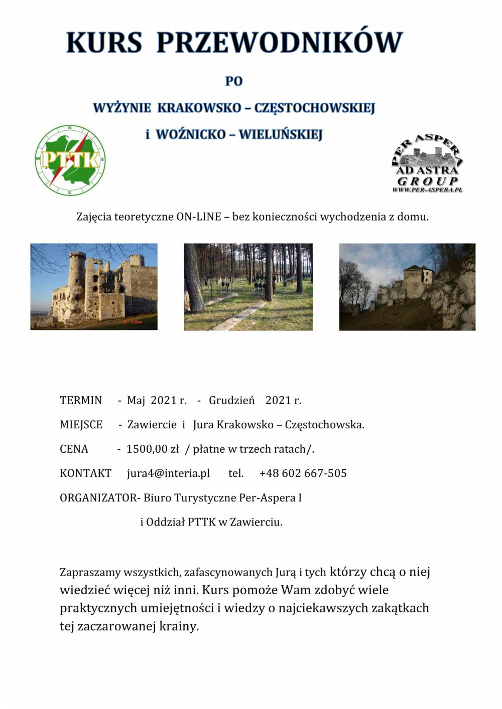 Koło Przewodników przy Oddziale PTTK w Zawierciu i Biuro Per-Aspera I organizują kolejną edycję kursu przewodników po Jurze Krakowsko-Częstochowskiej. Zajęcia teoretyczne odbędą się on-line. Kurs odbędzie się w terminie od maja 2021 do grudnia 2021.
