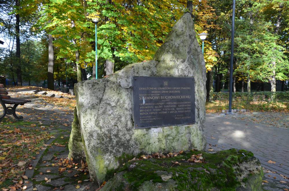 11 listopada 1981 roku działacze olkuskiej „Solidarności” oraz Towarzystwo Przyjaciół Ziemi Olkuskiej ufundowali niewielki, kamienny obelisk z pamiątkową płytą, który postawiono w parku miejskim, niemal naprzeciw domu, w którym mieszkał gen. Buchowiecki. Na tablicy z brązu można przeczytać: „Zasłużonemu lekarzowi i społecznikowi miasta i ziemi olkuskiej doktorowi medycyny Stefanowi Buchowieckiemu (1863-1927) oficerowi Legionów, współorganizatorowi wojskowej służby sanitarnej, generałowi brygady Wojsk Polskich, kawalerowi Virtuti Militari i Krzyża Walecznych – w hołdzie społeczeństwo”.
