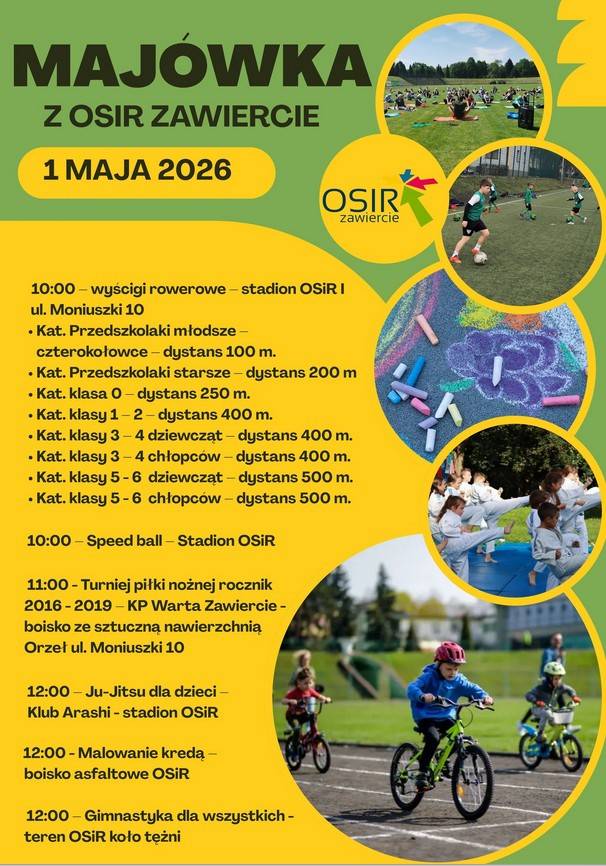 Zapraszamy na Majówkę dla dzieci  z OSiR Zawiercie. 1 maja spędzamy na sportowo – widzimy się na terenie OSiR przy ulicy Moniuszki.